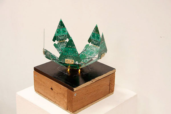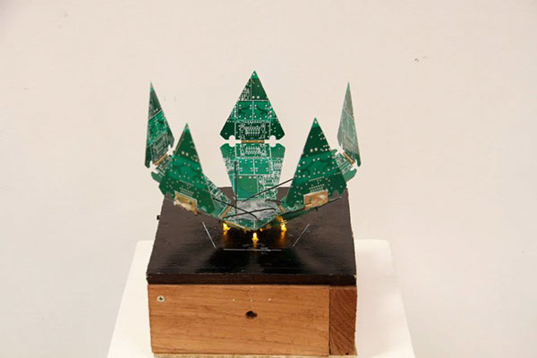 flow[er] is an interactive flower made completely of recycled materials that responds to movement. flow[er] senses your presence and ‘blossoms’. It represents the cycles and flow of energy of creation and destruction in cities. Our actions have the ability to create beauty, the question is, what do you think is beautiful?